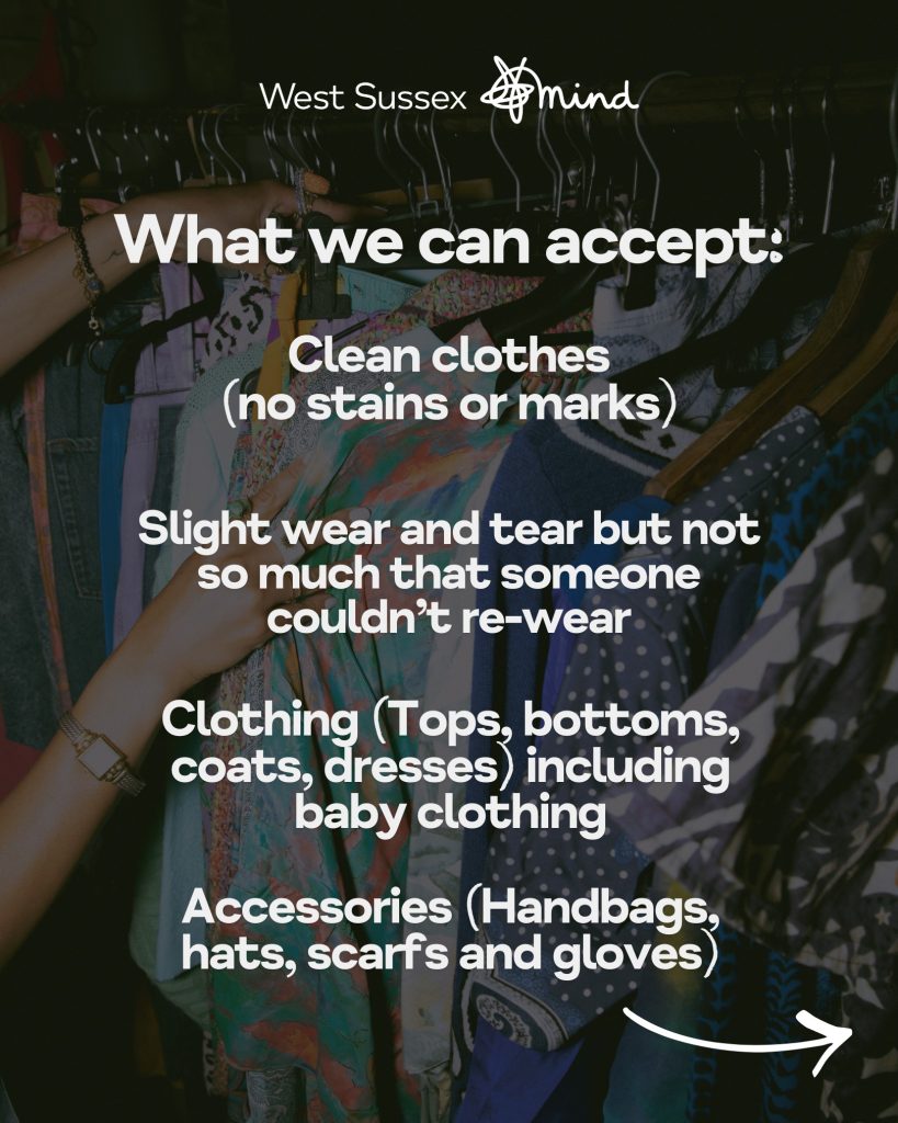 A Kilo Sale is a fun and sustainable way of fundraising — second-hand clothes and accessories are donated to the charity and then sold by weight rather than individual prices. Participants fill a bag with donated items and pay according to the total weight, with the proceeds going to support West Sussex Mind’s work in the local community.