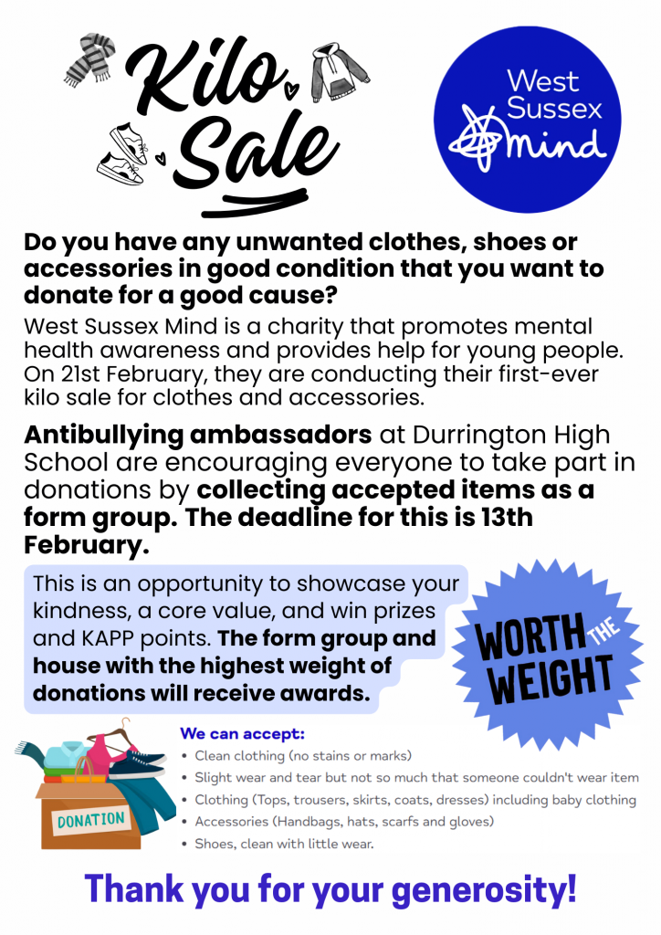As part of our commitment to community engagement and student leadership, Durrington High School will be taking part in a Kilo Sale fundraising event to support West Sussex Mind’s vital work in helping people in our county with their mental health. West Sussex Mind has been supporting children, young people and adults across West Sussex for over 50 years, providing local mental health support, services and community activities.