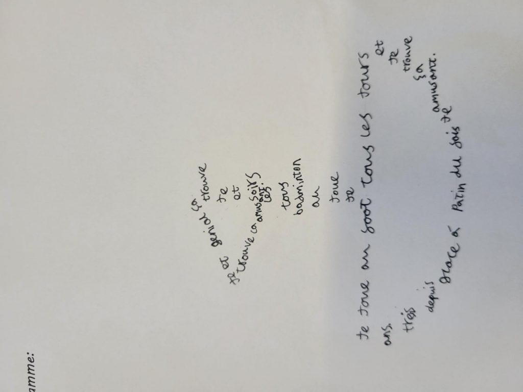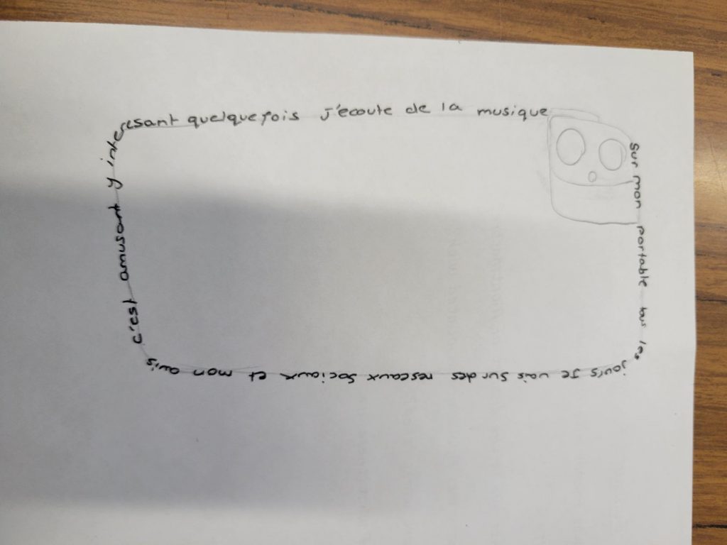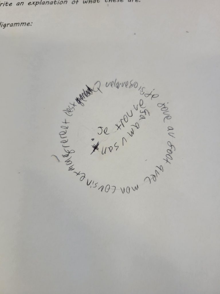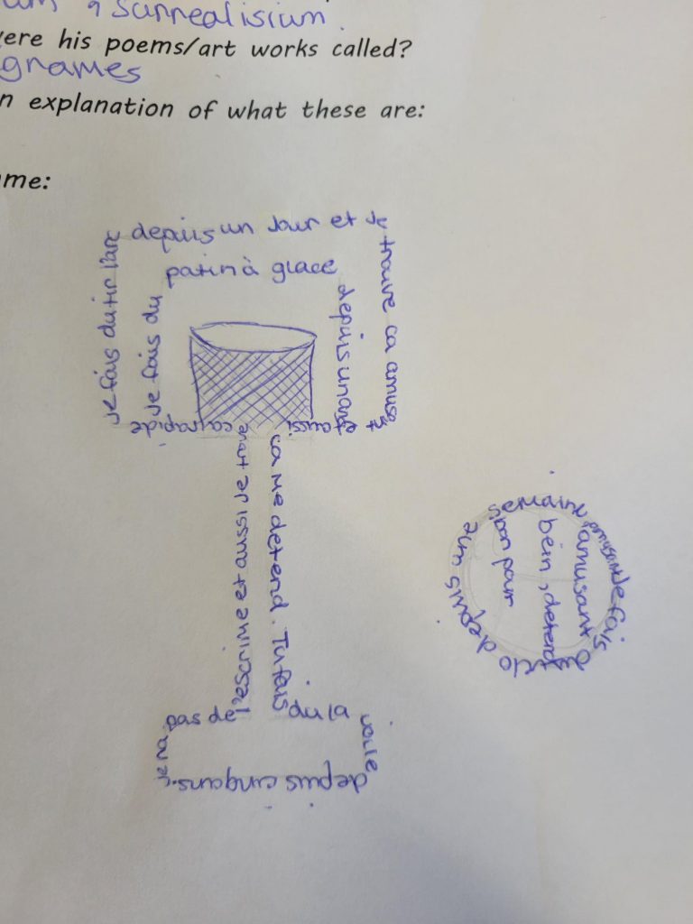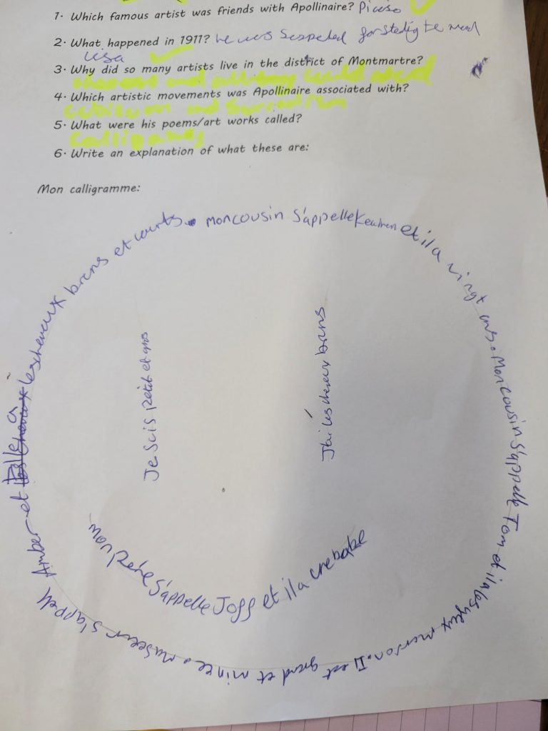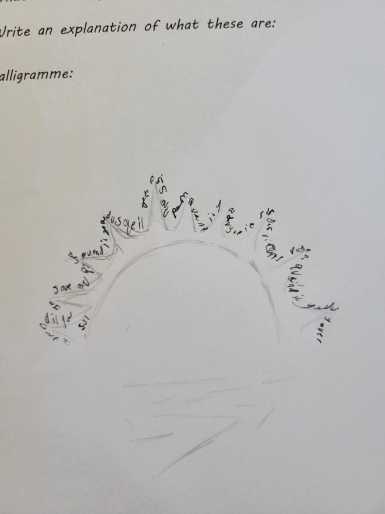 Year 8 French students created their own calligramme poems inspired by the French-Polish artist, poet, novelist and playwright Guillaume Apollinaire (1880–1918). Writing in French, students described themselves, their friends and families, or their favourite activities using creative shapes, just like the famous poet himself.